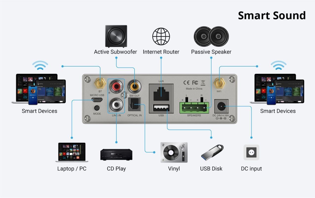 1. Kết nối wifi - Ampli A50 hỗ trợ kết nối WiFi chuẩn 2.4GHz, cho phép truyền tải nhạc không dây với độ ổn định cao và phạm vi rộng trong nhà.