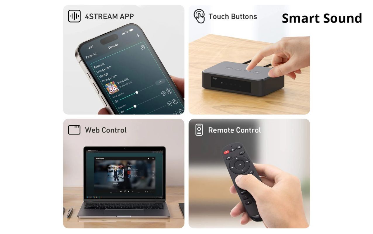 Ứng dụng 4STREAM cung cấp giao diện điều khiển trực quan và dễ sử dụng cho hệ thống Preamp Arylic S10+. Người dùng có thể dễ dàng quản lý nhạc, điều chỉnh âm lượng, và thiết lập hệ thống âm thanh đa vùng thông qua smartphone.